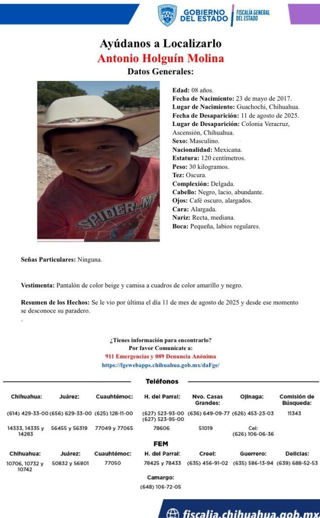 Las acciones policiales, comenzaron a las 14 horas de ayer martes 12 de agosto, con el objetivo de ubicar a los niños Sara y Antonio, ambos de apellidos Holguín Molina, de 10 y 08 años de edad respectivamente y miembros de la comunidad tarahumara, con quienes se tuvo contacto por última vez en la colonia Veracruz del Municipio de Ascensión.