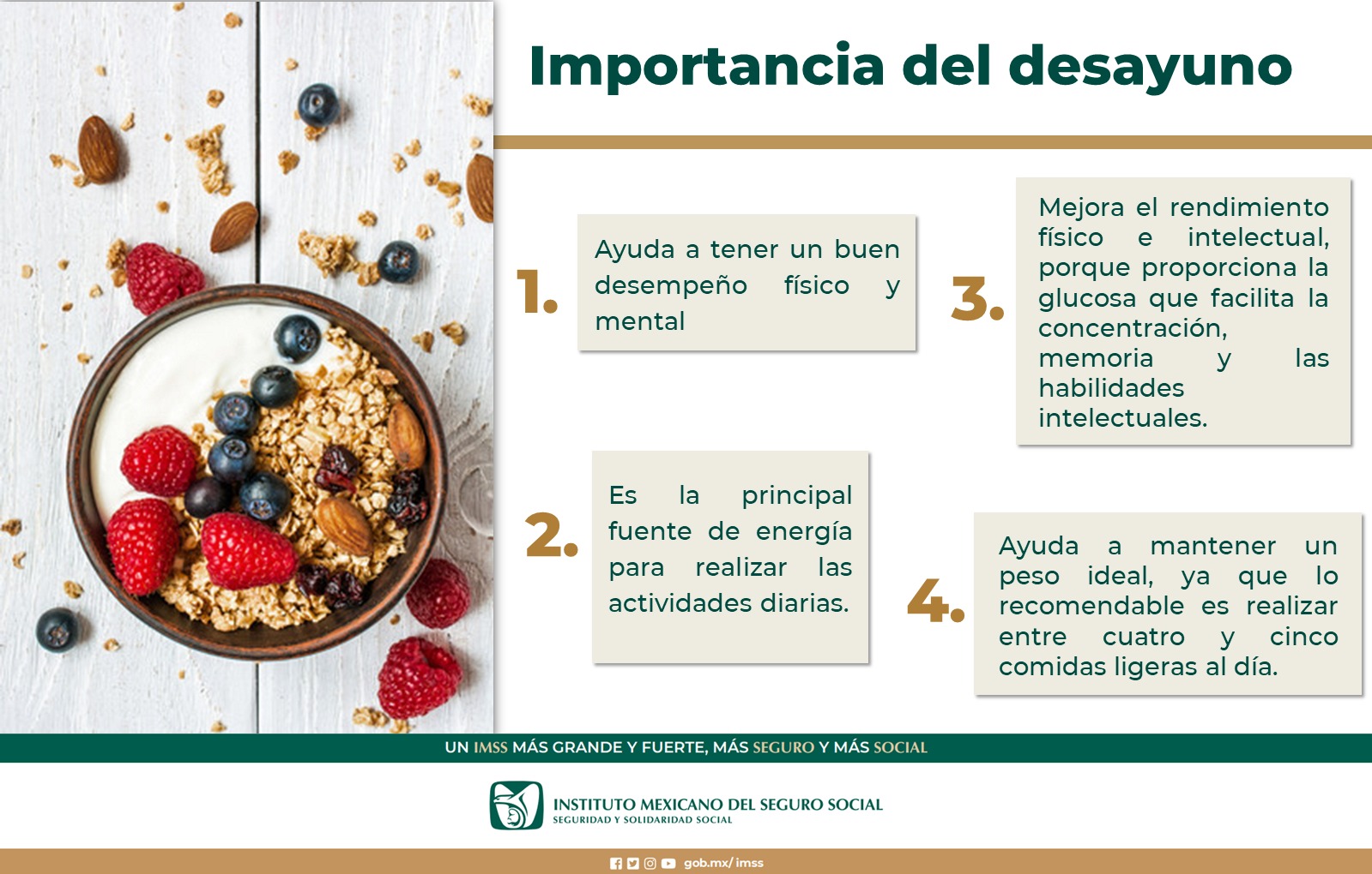 El primer alimento del día ayuda a controlar el peso, reduce el riesgo de obesidad y brinda al cuerpo la energía necesaria para realizar las actividades diarias, así lo informa el Instituto Mexicano del Seguro Social (IMSS) en Chihuahua.