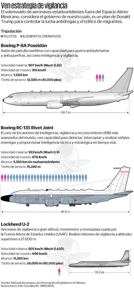 Integrantes de las Fuerzas Armadas detectaron tres aeronaves militares espías de Estados Unidos que han sobrevolado —fuera del Espacio Aéreo Mexicano— los límites de nuestro país y que, entre sus principales funciones, se encuentra la intercepción de comunicaciones.