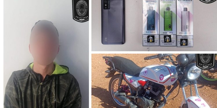 El presunto, identificado con las iniciales D.A.B.O., fue detenido en los términos de la flagrancia cuando vendía vapeadores o cigarrillos electrónicos a estudiantes de una escuela secundaria ubicada en la calle Sección 20 y periférico sur, en la ciudad de Parral.