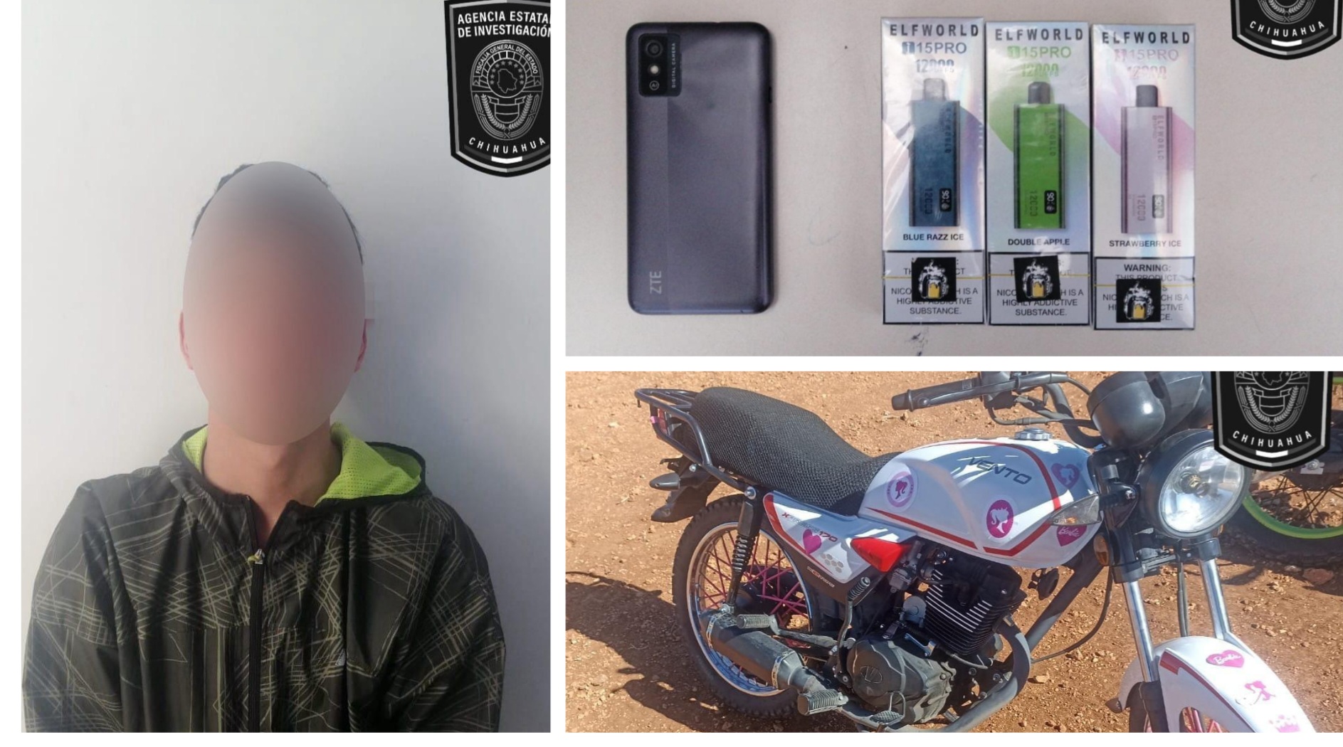 Al presunto le aseguraron tres vapeadores de la marca Elfworld, un teléfono celular marca ZTE de color gris y una motocicleta marca Vento, línea Xpress, de color blanco.
