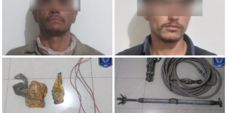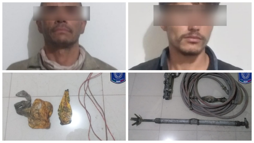 En atención a un reporte de allanamiento en las instalaciones de la empresa minera Grupo México, en el municipio de Santa Bárbara, elementos de la Agencia Estatal de Investigación (AEI), detuvieron en el término legal de la flagrancia a dos masculinos como probables responsables de dicho delito.