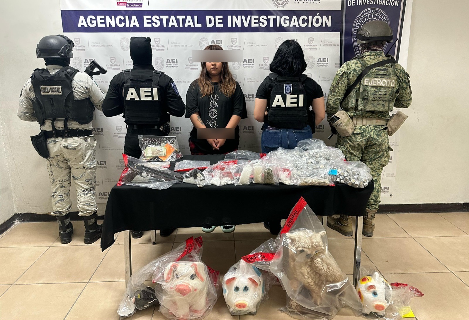 Elementos de la Agencia Estatal de Investigación adscritos a la Fiscalía de Distrito Zona Norte, en coordinación con la Guardia Nacional y la Secretaría de la Defensa Nacional, detuvieron a una persona de nombre Nancy M. D., por el delito de posesión ilegal de armas de fuego y por delitos contra la salud.