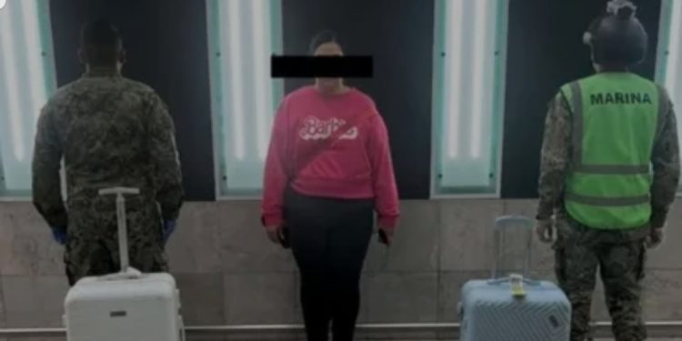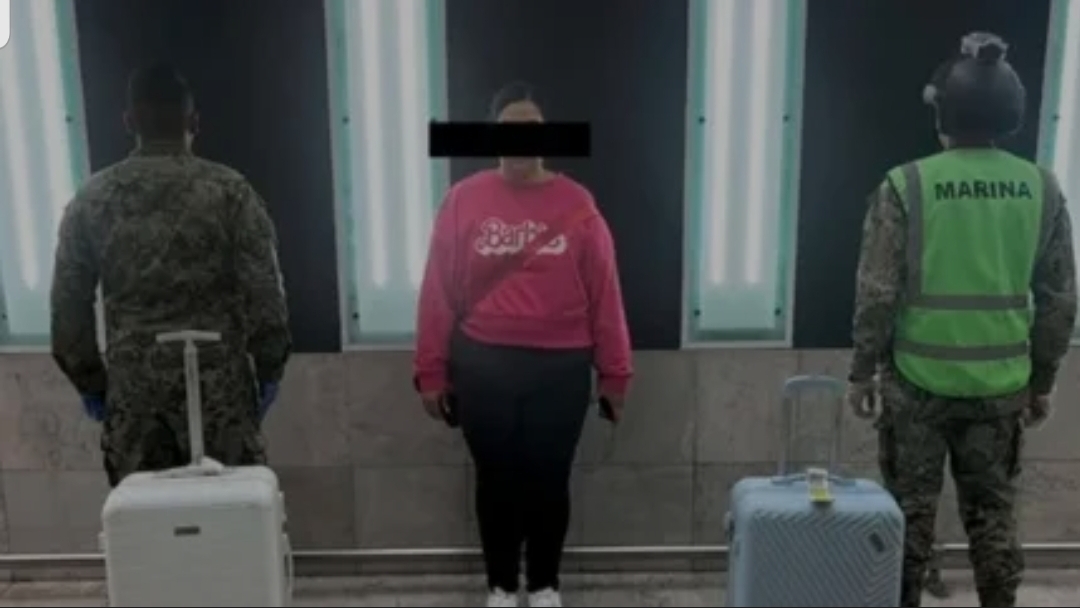 Las imágenes difundidas por el AICM, a través de su cuenta de Twitter, muestran a la detenida con dos maletas que contenían la sustancia ilegal.