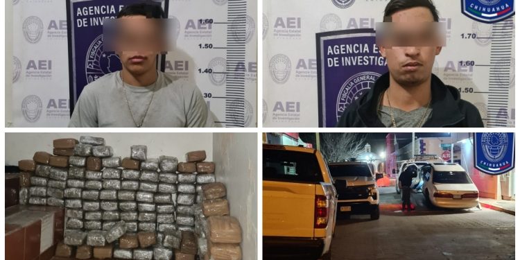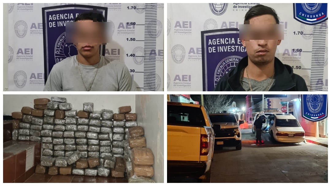 Dentro de las tareas permanentes de investigación, prevención y combate de los delitos, elementos de la Agencia Estatal de Investigación detuvieron a dos jóvenes con 68 kilogramos de mariguana en el tramo carretero Santa Isabel – Chihuahua.