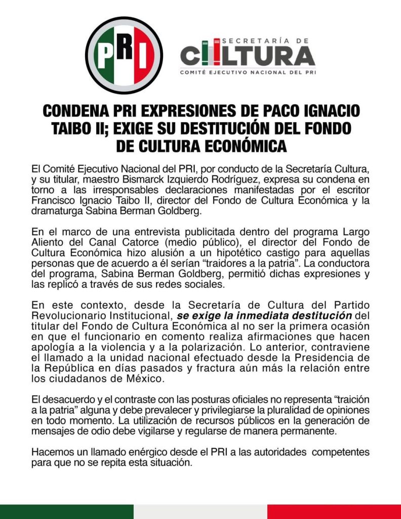 Luego de que el director del Fondo de Cultura Económica, Paso Ignacio Taibo II, sugiriera que quienes apoyen las acciones del presidente de Estados Unidos, Donald Trump, deberían ser condenados a la pena de muerte, el Comité Ejecutivo Nacional del PRI, por conducto de la Secretaría Cultura y su titular, Bismarck Izquierdo Rodríguez, expreso su condena en torno a lo que consideran «iresponsables declaraciones» manifestadas por el escritor.