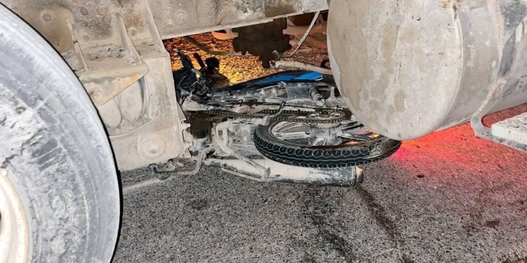 De acuerdo con los primeros datos recabados en el lugar, el operador del camión involucrado abandonó la escena tras el choque, dejando el dompe detenido sobre la motocicleta en la que se desplazaban los jóvenes.
