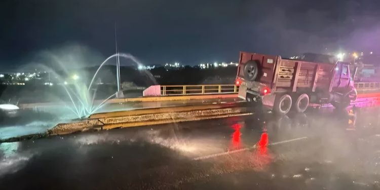 Al arribar al sitio, elementos de Vialidad y paramédicos de la Cruz Roja localizaron un dompe de color rojo severamente dañado, detenido sobre el camellón central a la altura del puente. De manera preliminar, se indicó que el conductor perdió el control de la unidad, saliéndose de la cinta de rodamiento hasta impactar directamente contra la estructura de concreto.