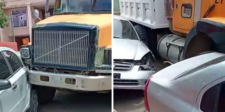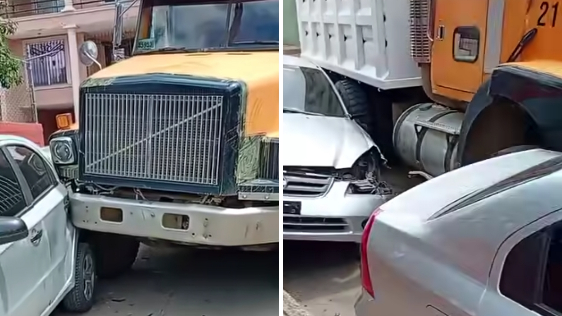 El camión terminó chocando contra un automóvil Nissan Altima, modelo 2003, color gris, y un Chevrolet Aveo, modelo aproximado 2011, también color gris, ambos con severos daños materiales.