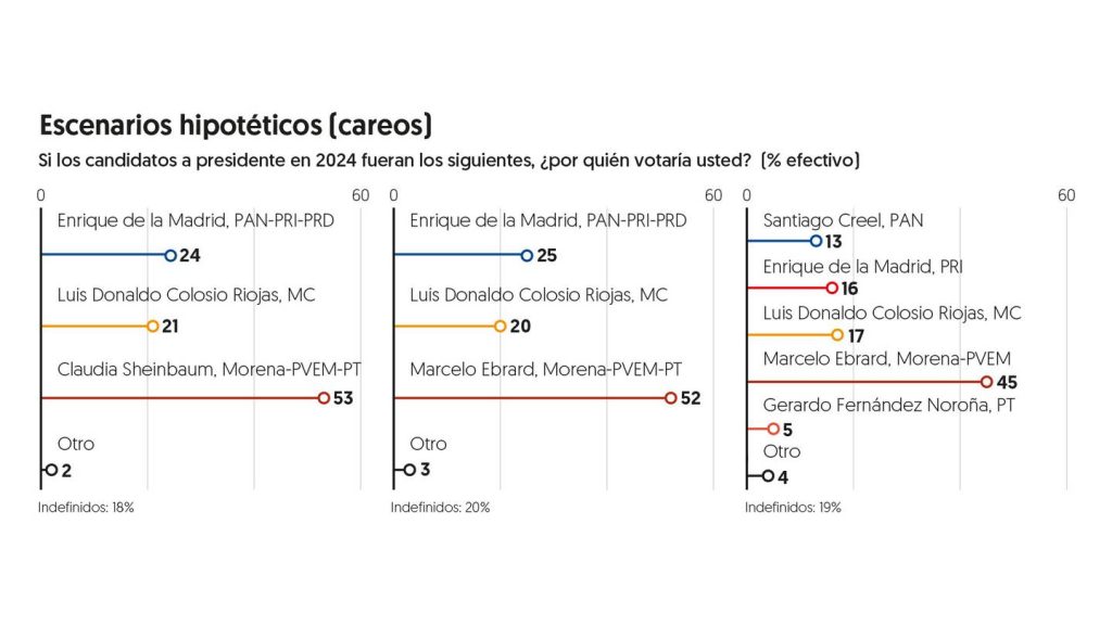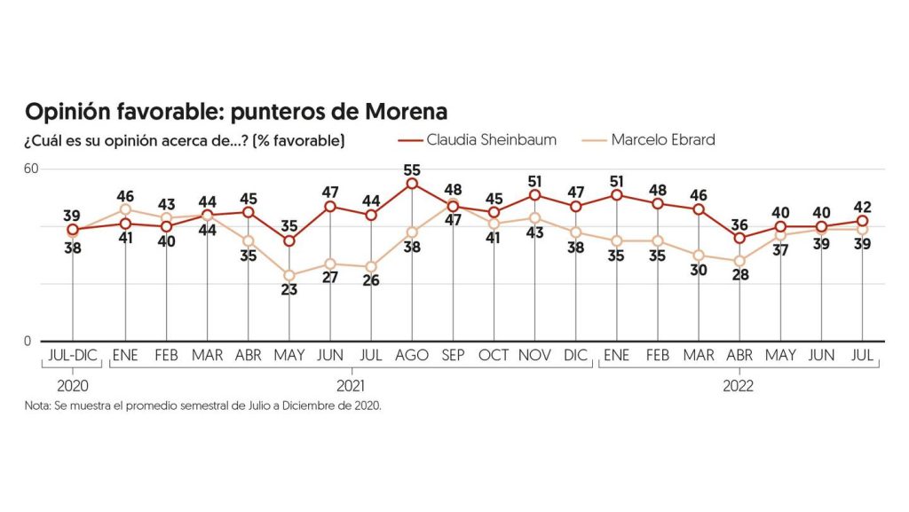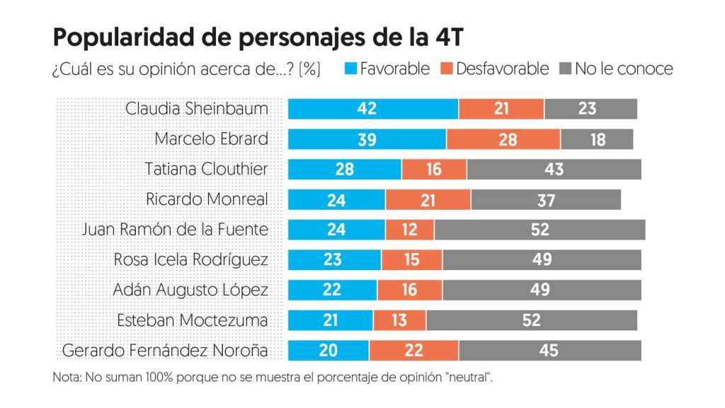 En julio, Sheinbaum registra 42 por ciento de opinión positiva y 77 por ciento de conocimiento, mientras que Ebrard capta 39 por ciento de opinión positiva y 82 por ciento de conocimiento. En tercer lugar se ubica Tatiana Clouthier, con 28 por ciento de opinión favorable y 57 por ciento de conocimiento.