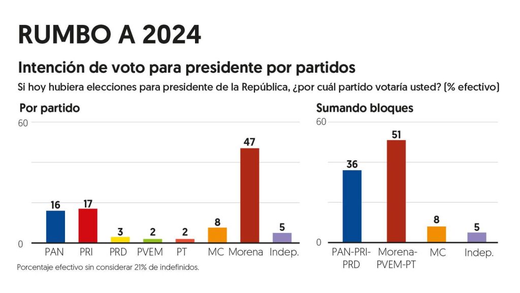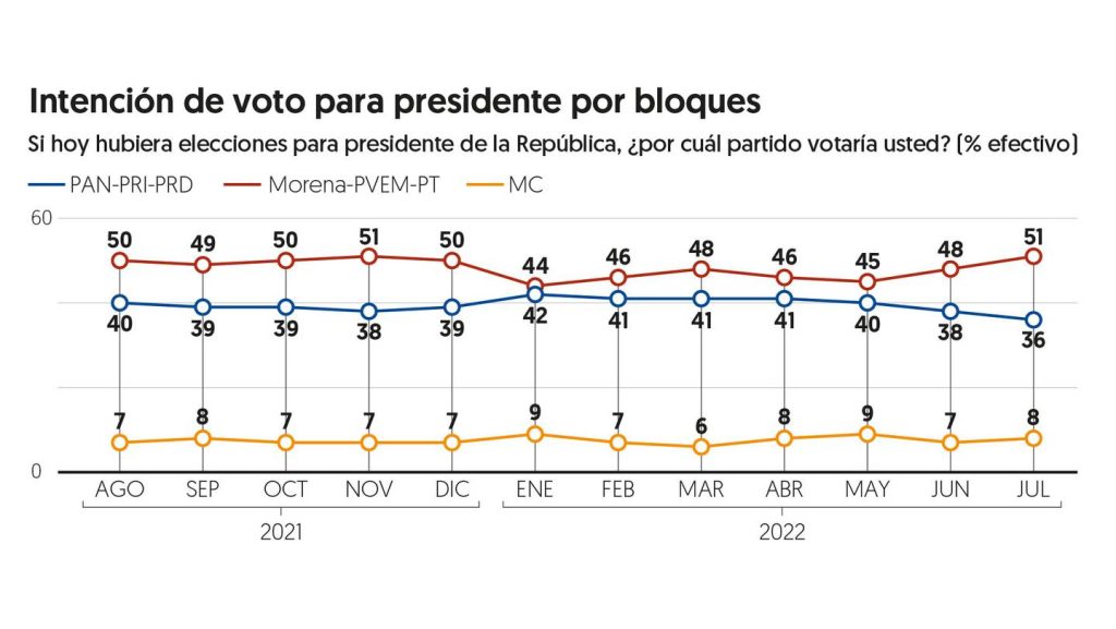 El apoyo ciudadano a la alianza opositora PAN-PRI-PRD rumbo a los comicios de 2024 registró una variación a la baja por tercer mes consecutivo, disminuyendo de 41 a 36 por ciento entre abril y julio, mientras que el respaldo a Morena y sus aliados subió de 46 a 51 por ciento en el mismo lapso, de acuerdo con la más reciente encuesta nacional de El Financiero.