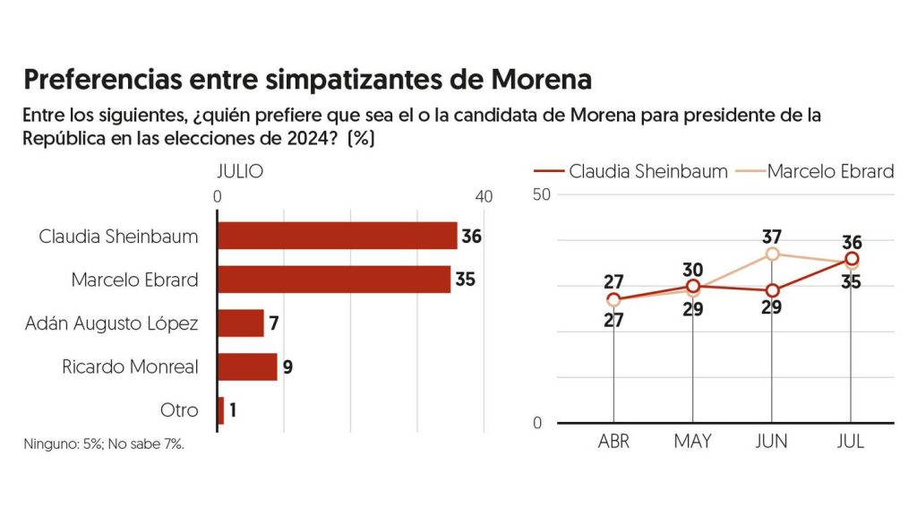 Si bien el mes pasado Ebrard tomó la delantera en preferencias para ser el candidato de Morena a la Presidencia, en julio, Sheinbaum retoma la primera posición en las preferencias de la población general, aunque sigue pareja con Ebrard entre los simpatizantes de Morena.