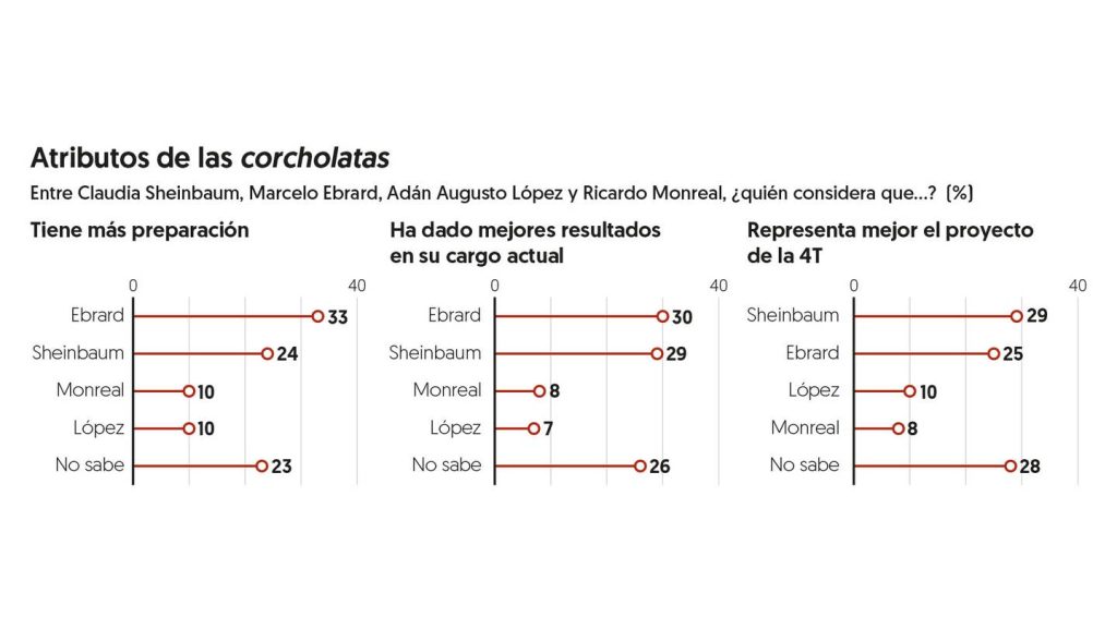 De acuerdo con la encuesta, y considerando a cuatro de las corcholatas presidenciales, Ebrard destaca en las percepciones como el que tiene más preparación, Sheinbaum, la que mejor representa el proyecto de la 4T, y ambos están muy parejos en la respuesta de quién ha dado mejores resultados en su cargo actual.
