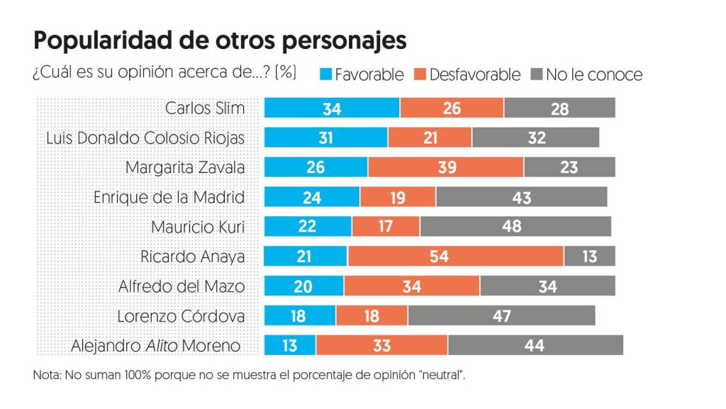 Alejandro Alito Moreno cuenta con 13 por ciento de opinión positiva y 33 por ciento negativa, y un conocimiento de 56 por ciento. Sólo por comparación, en esta encuesta se midió la popularidad de Carlos Slim, quien acompañó al presidente en su reciente viaje a Washington, DC; el empresario obtiene 34 por ciento de opinión positiva y es conocido por 72 por ciento. Por su parte, el consejero presidente del INE, Lorenzo Córdova, registra 18 por ciento de opinión positiva, 18 por ciento negativa y 53 por ciento de conocimiento.