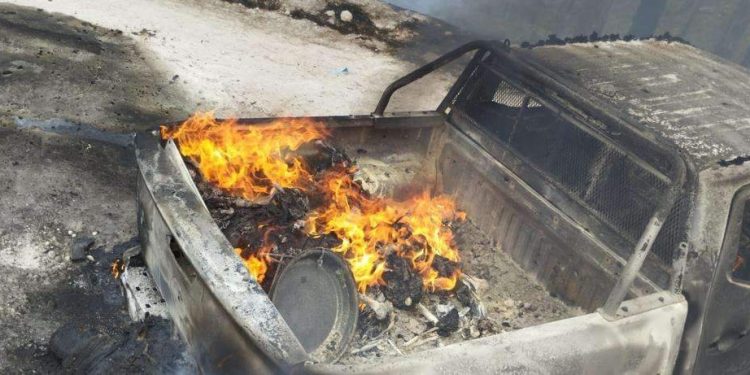 La camioneta de Díaz Meza quedó completamente calcinada, así como otra Chevrolet Silverado, y unas más, una Dodge RAM, que culminó su trayecto impactada contra un árbol y que tenía impactos de arma de fuego.