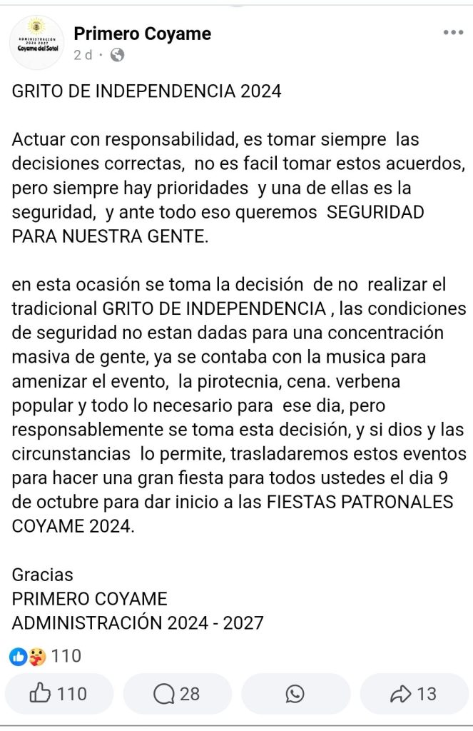 La Presidencia Municipal de Coyame del Sotol comunicó, a través de Facebook, que no hay condiciones para que sean realizados los Festejos Patrios, por lo que serán cancelados para hoy 15 de septiembre.