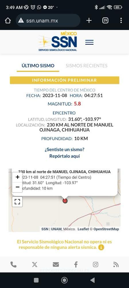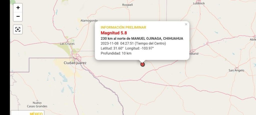 Esta mañana La Coordinación Estatal de Protección Civil recibió varios reportes del C-4 que indicaban un sismo ocurrido en el municipio de Manuel Ojinaga, en punto de las 04:27:51 horas con epicentro en Latitud 31.60° y Longitud -103.97° y con una profundidad de 10 kilómetros.