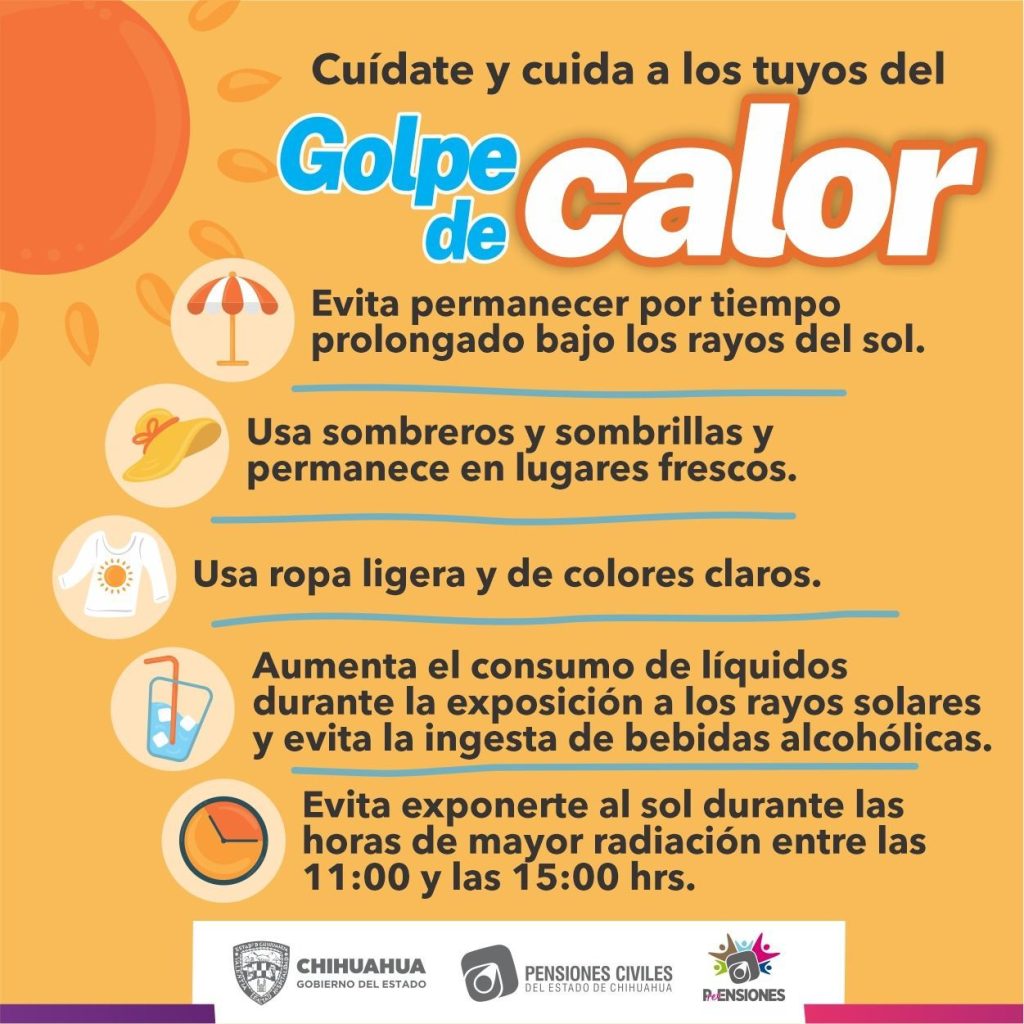 Ante las altas temperaturas que se presentan en Chihuahua, Pensiones Civiles del Estado (PCE) recomienda a la población tomar las debidas precauciones para prevenir daños a la salud como golpes de calor y quemaduras solares, en especial en niñas, niños, personas con discapacidad y adultos mayores.