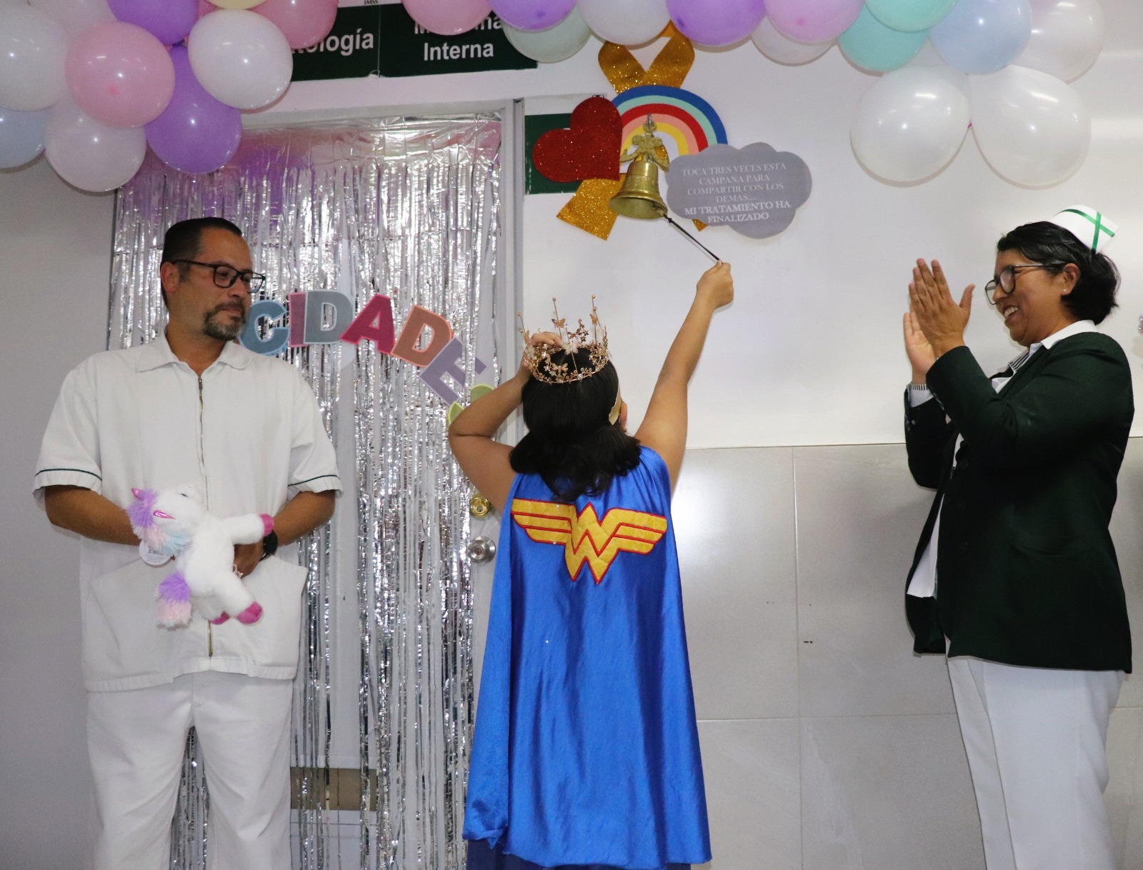 Este viernes, Ana Sofía de nueve años, procedente del municipio de Delicias, Chihuahua, tocó la “Campana de la Esperanza” del Hospital General Regional (HGR) No.01, “Morelos”, del Instituto Mexicano del Seguro Social (IMSS) en la entidad.