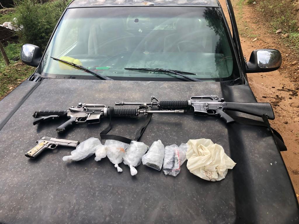 Una vez asegurados, se les aseguró 2 armas largas calibre .223, un arma corta calibre .45, además de 10 porciones de un polvo blanco similar a la cocaína y 5 paquetes de plástico que contenían una hierba seca, verde y olorosa con las características propias de la mariguana.