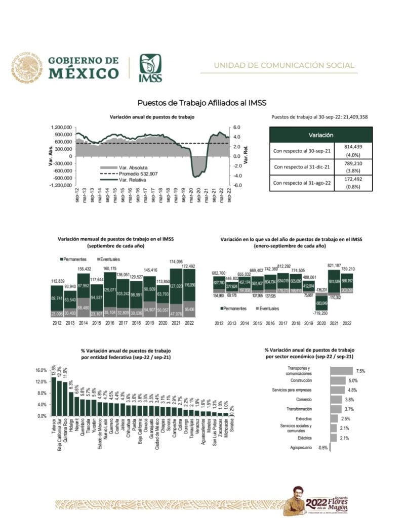 · Al 30 de septiembre de 2022, se tienen registrados ante el Instituto Mexicano del Seguro Social (IMSS) 21,409,358 (veintiún millones cuatrocientos nueve mil trescientos cincuenta y ocho) puestos de trabajo; de éstos, el 86.6% (ochenta y seis punto seis por ciento) son permanentes y el 13.4% (trece punto cuatro por ciento) son eventuales.