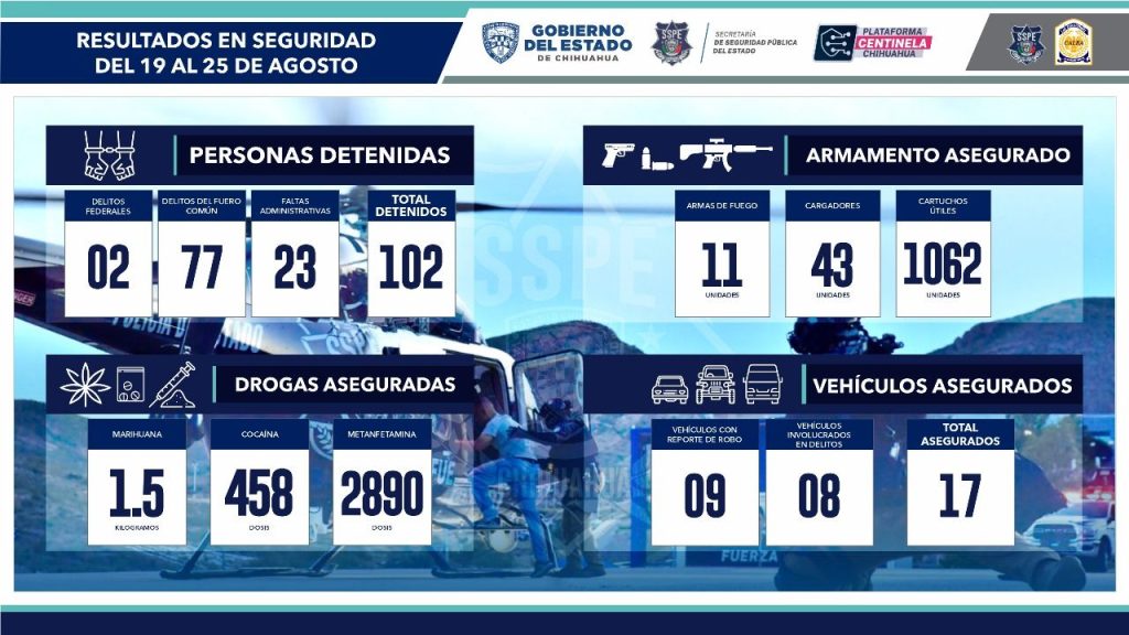 La Secretaría de Seguridad Pública del Estado (SSPE) informó que del 19 al 25 de agosto, se llevó a cabo la detención de 102 personas, así como el aseguramiento de diversos artefactos relacionados con la comisión de algún delito en la entidad.