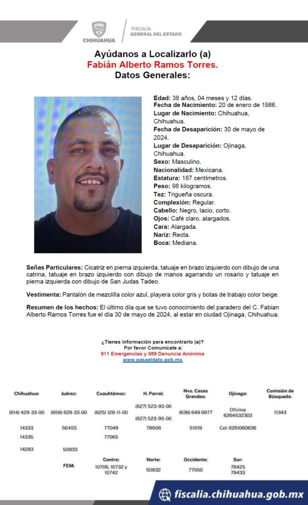 Para lo cual, se efectúa investigación de inteligencia y trabajo de campo con la búsqueda en la ciudad de Ojinaga, así como por brechas y caminos vecinales a fin de dar con su paradero.