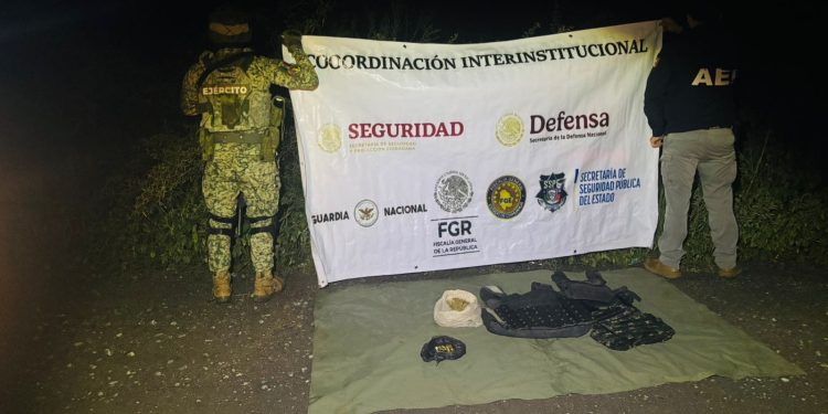 Cuando las unidades circulaban por el camino en mención, encontraron 328 gramos de marihuana, 40 cartuchos calibre 9mm. y tres chalecos tácticos de color negro, llevando a cabo el aseguramiento para su puesta a disposición del Ministerio Público.