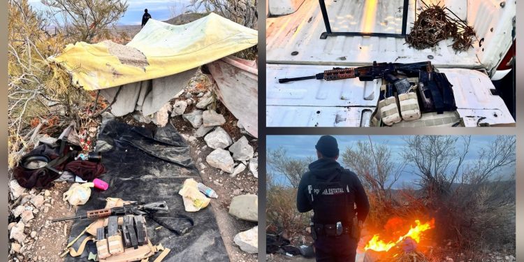 Como parte de las acciones del Operativo Blindaje Carretero, la Policía de Despliegue de la Secretaría de Seguridad Pública del Estado (SSPE), mediante vigilancia mixta terrestre y aérea, aseguró un arma larga de fuego, cargadores y cartuchos en un campamento clandestino presuntamente utilizado por integrantes del crimen organizado, en la vía corta Chihuahua–Parral.