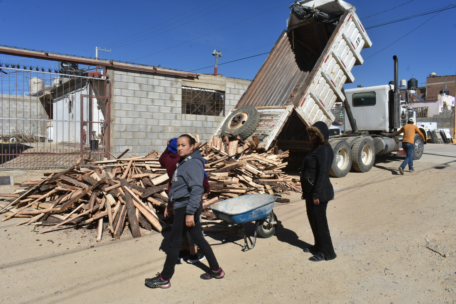 Luego del corte del listón inaugural de la calle Guadalupe y Calvo, tres camiones repletos de leña realizaron la descarga del combustible del programa Invierno sin Frío en tres puntos diferentes para facilitar el acopio de los vecinos.
