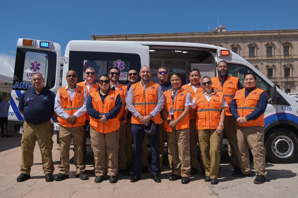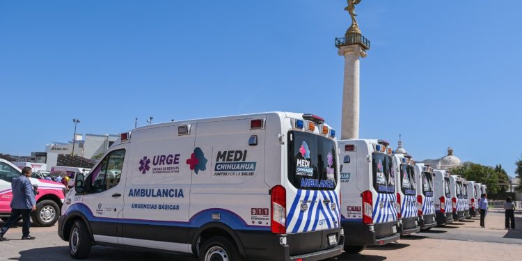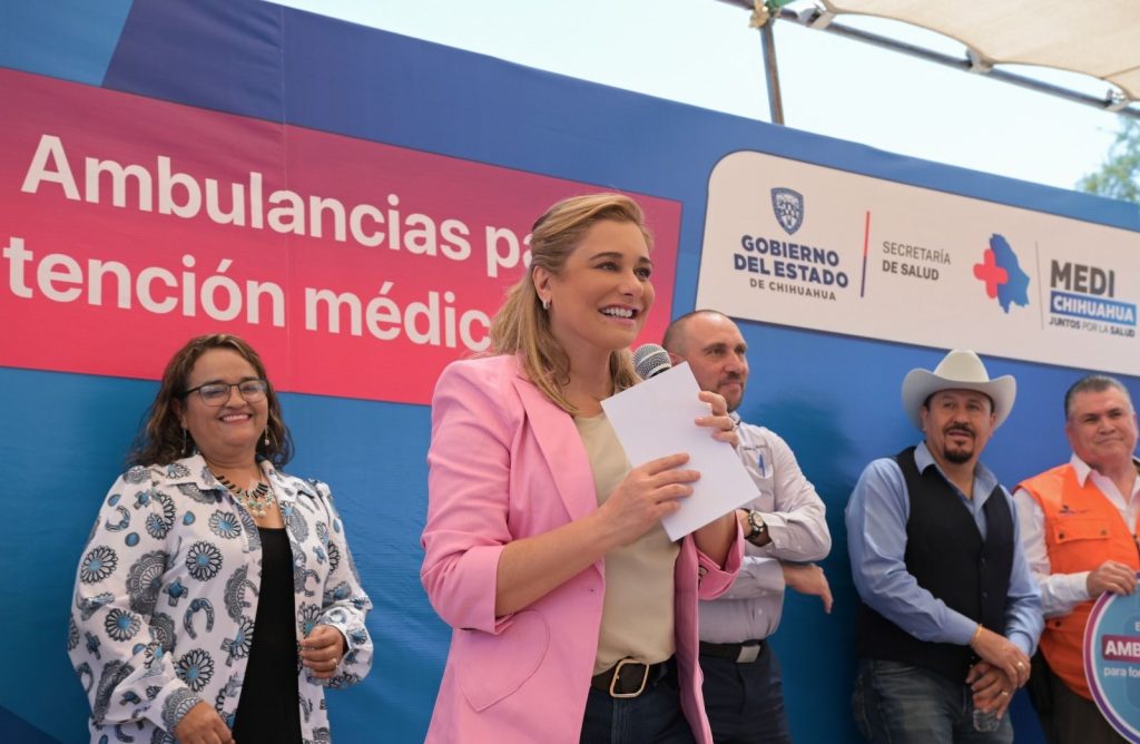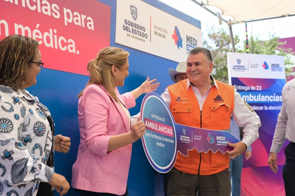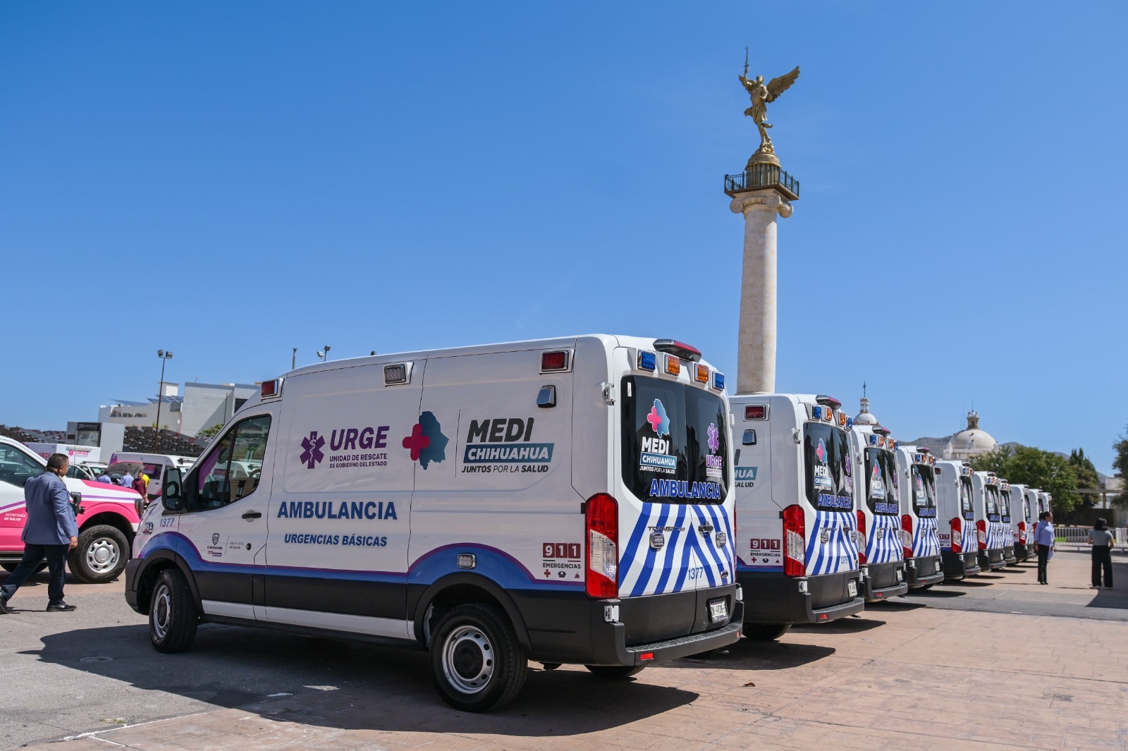 La gobernadora Maru Campos encabezó en la Plaza del Ángel la ceremonia de entrega de 23 nuevas ambulancias, adquiridas con una inversión de 44 millones 396 mil pesos para reforzar el servicio que brinda la Unidad de Rescate de Gobierno del Estado (URGE) en los municipios.