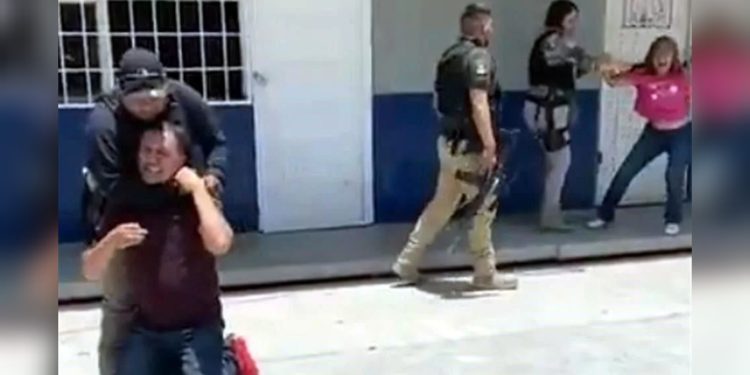 En el video se puede ver a tres patrullas de la Policía Estatal detenidas al lado de un auto que es inspeccionado por elementos de esa corporación.