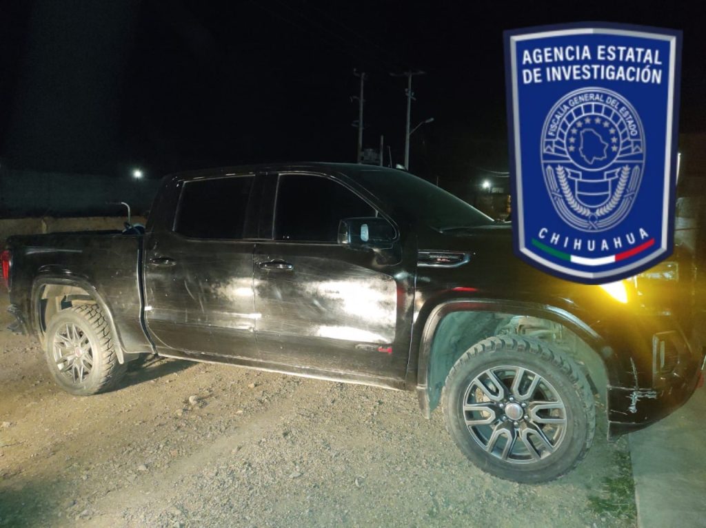 - Un vehículo de la marca GMC Sierra Color negro con matrícula del estado de Chihuahua, la cual cuenta con reporte de robo.