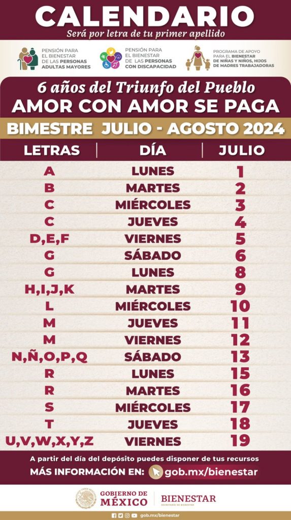 Ante una larga espera por la veda electoral, Ariadna Montiel, titular de la Secretaría del Bienestar, reveló el calendario, con las fechas y apellidos, del pago de pensiones (para Adultos Mayores, Personas con Discapacidad y Madres Trabajadoras), correspondiente al mes de julio 2024.