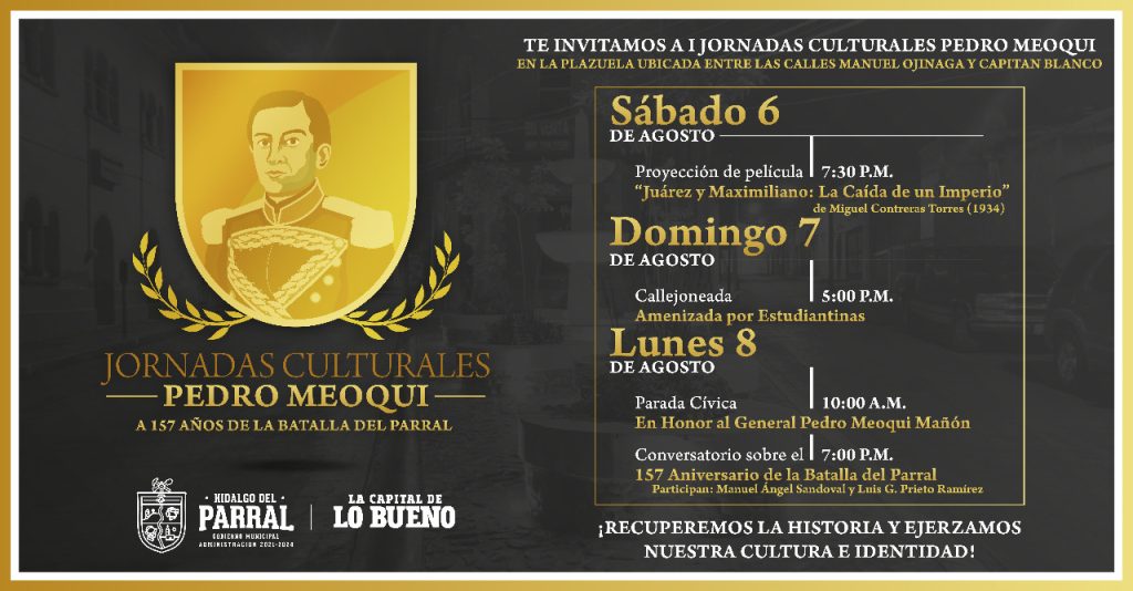 Las primeras Jornadas Culturales dedicadas al general Pedro Meoqui comenzarán este 6 de agosto. Se proyectará, en un cine ambulante y al aire libre, la película “Juárez y Maximiliano: La caída de un imperio”, el cual fue un filme que dirigió Miguel Contreras Torres y que además representa un antecedente de la famosa Época de Oro del Cine Mexicano.