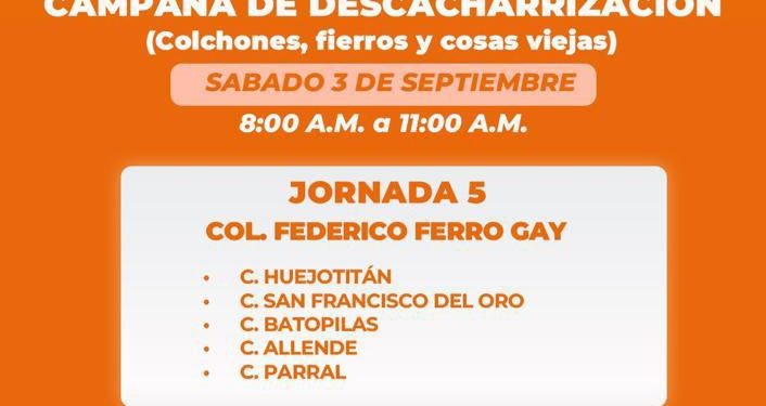 En el marco del programa “Parral Limpio”, este sábado 3 de septiembre, el esfuerzo municipal para lograr un mejor entorno dentro y fuera de los hogares parralenses llega a la colonia Federico Ferro Gay, en un recorrido por las calles Huejotitán, San Francisco del Oro, Batopilas, Allende y Parral.