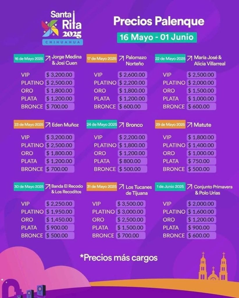 Don Boletón, la empresa encargada de la venta oficial de los acceso para la Feria Santa Rita 2025, público los precios de las presentaciones en el Palenque.