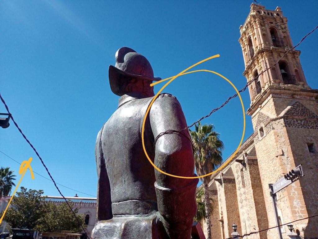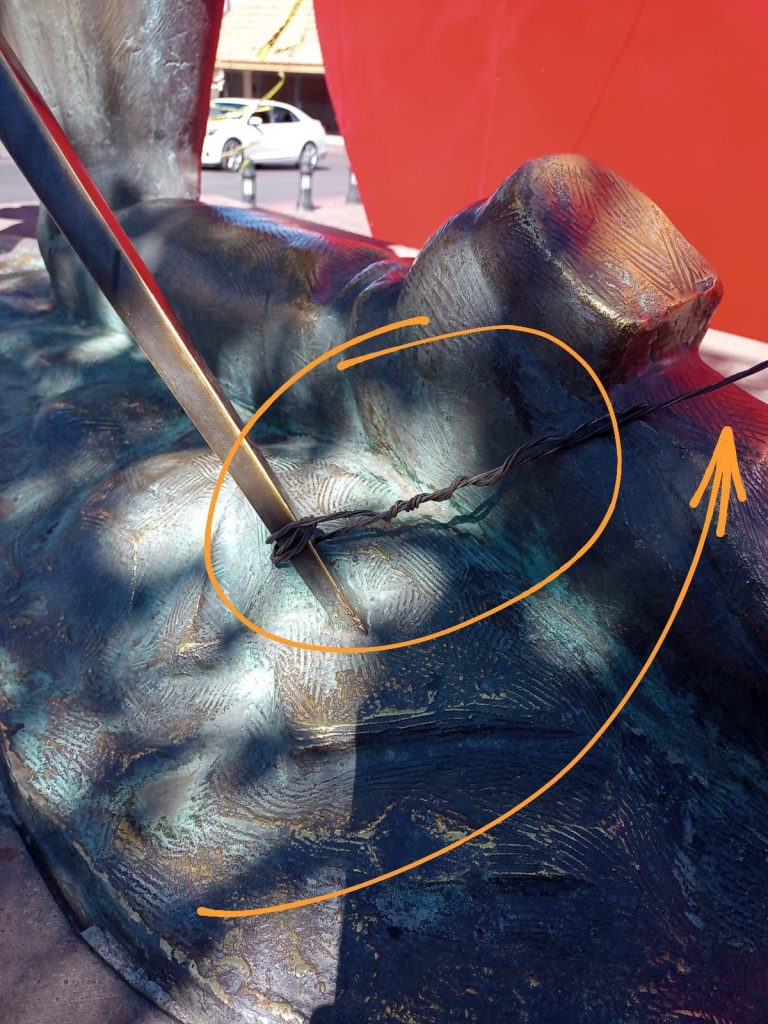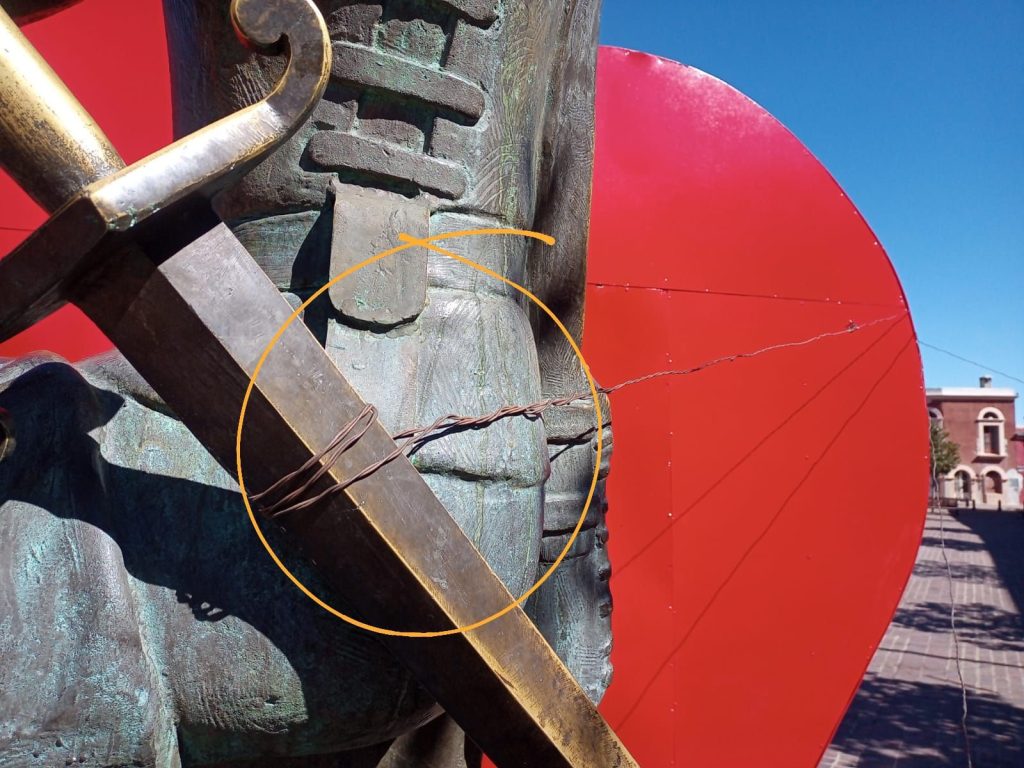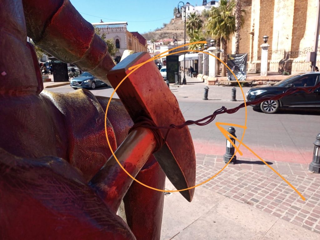 En un recorrido por el lugar, se recabaron evidencias de que la enorme estructura está «agarrada» de uno de los bolardos que delimitan la plaza de la calle; por arriba, otro alambre corre hasta una de las luminarias del lugar y otros más se sujetan del brazo del minero que descubrió la mina La Negrita; pero también se sostienen de sus herramientas como el pico, y uno más del «calzado» de la estatua.