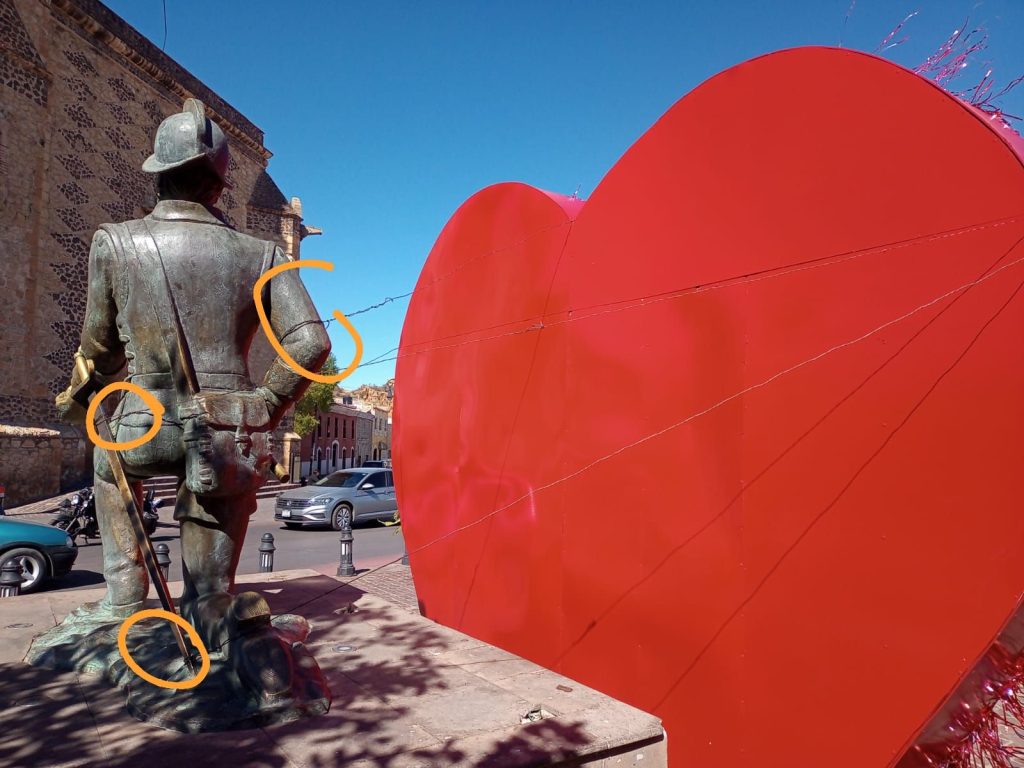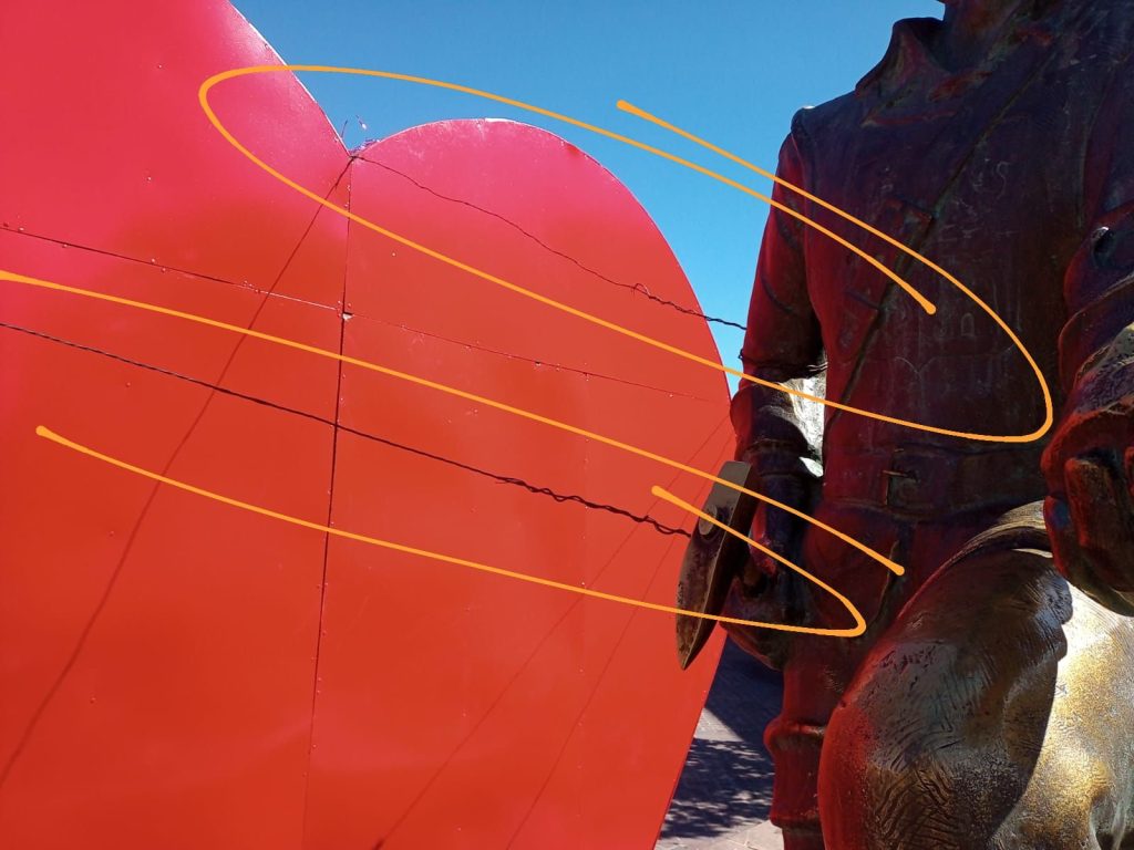 La figura de un corazón gigante que se encuentra en la Plaza de la Identidad, colocada por Presidencia Municipal para toma de fotos con motivo del mes del amor y la amistad, se encuentra sostenida por alambres de la escultura de Juan Rangel de Biezma.