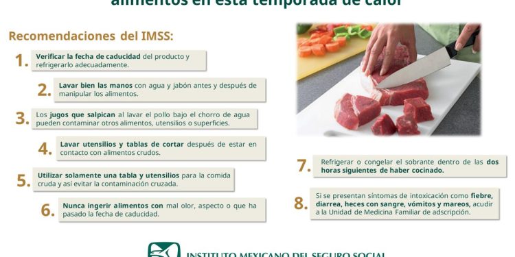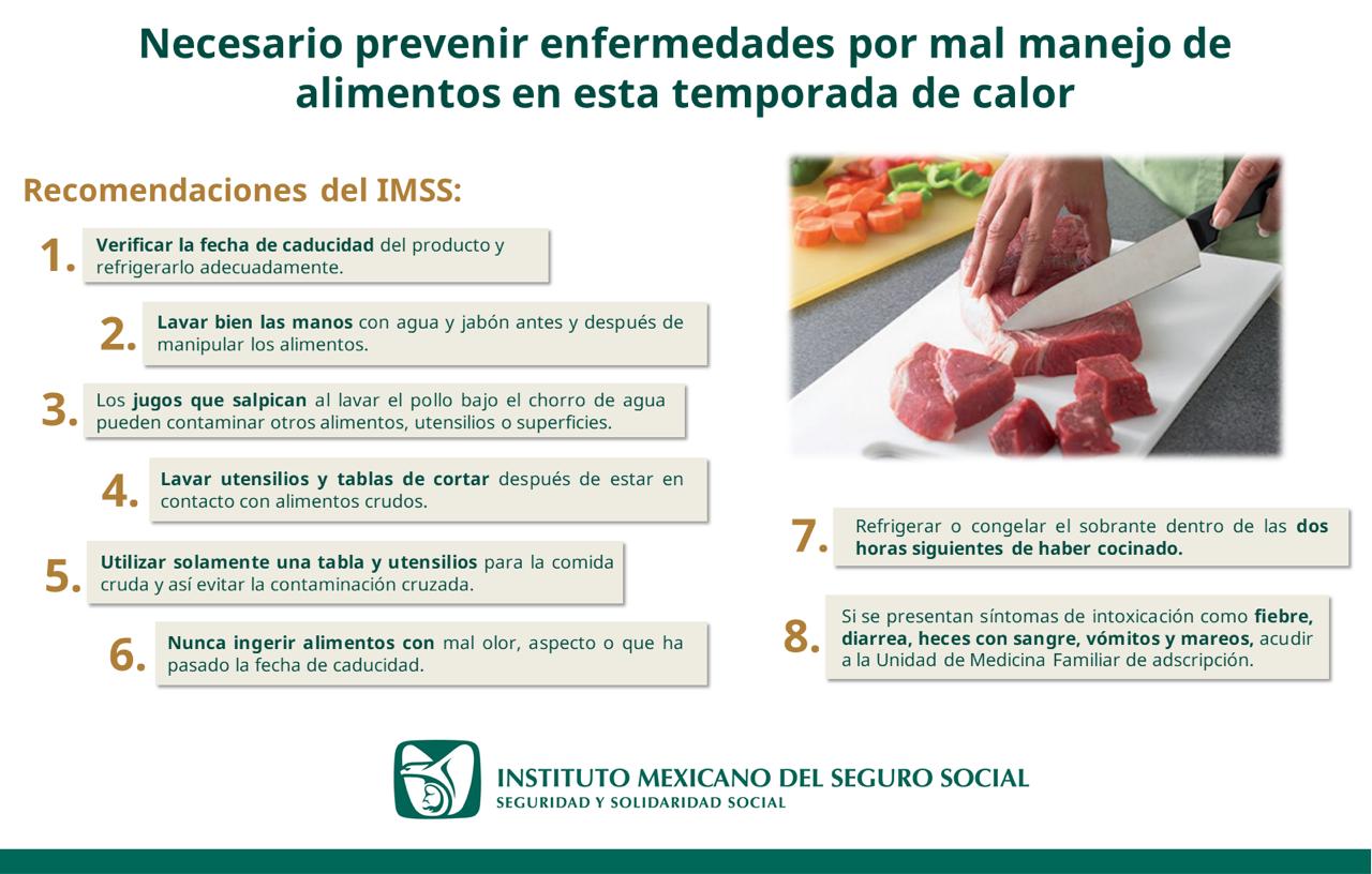 Ante las altas temperaturas en la entidad, y con el objetivo de prevenir enfermedades debido al mal manejo de alimentos, el Instituto Mexicano del Seguro Social (IMSS) en Chihuahua, informa a la población la importancia de extremar medidas preventivas al cocinar correctamente los productos de origen animal como el pollo, pescado y carne, ya que de no hacerlo se pone en riesgo la salud al provocar una intoxicación alimentaria.