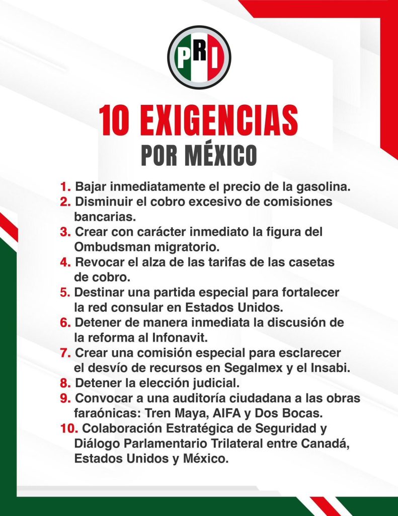 «El rumbo de México y la economía de las familias nos preocupan en el PRI. Por ello, impulsamos las 10 del PRI por México, un documento con exigencias firmes y soluciones urgentes para los desafíos nacionales», puntualizó el líder priista.