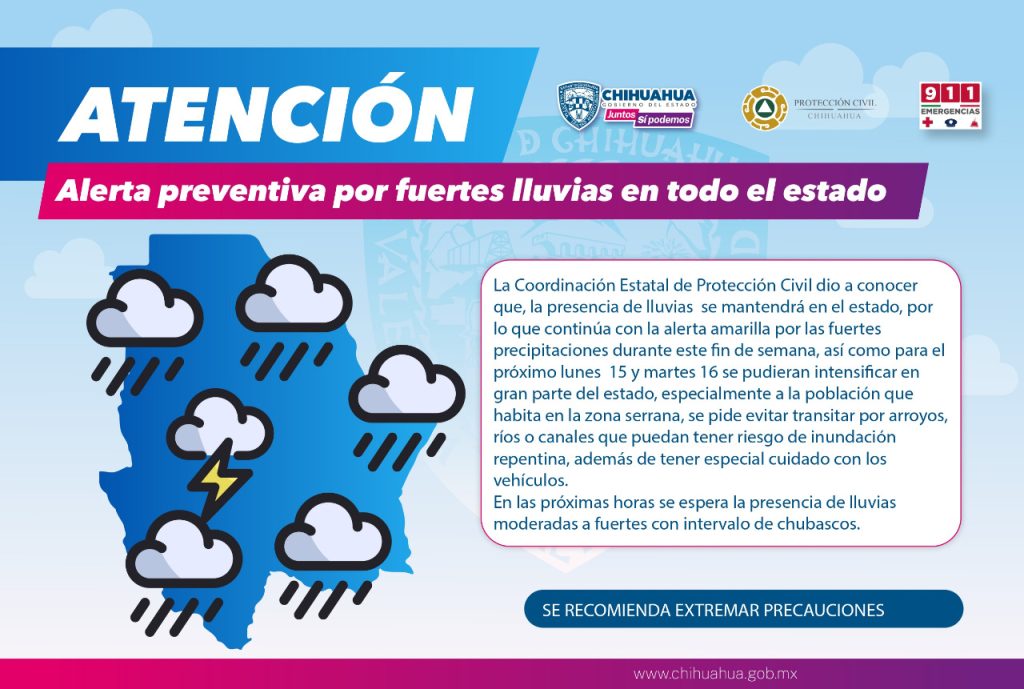 La Coordinación Estatal de Protección Civil (CEPC) informó que para este fin de semana y hasta el próximo martes 16 de agosto, continuarán las fuertes lluvias en el estado, por lo que se extiende la alerta amarilla, ya que podrían intensificarse en gran parte del territorio estatal.