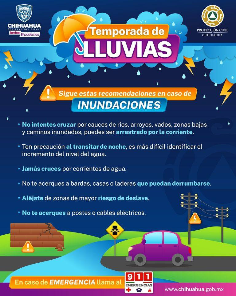Asimismo se recomienda esperar a que baje el volumen del agua en las calles y avenidas antes de utilizarlas, y en la medida de lo posible, se deberán tomar rutas alternas durante las precipitaciones pluviales y en caso de estar en riesgo, comunicarse al número de emergencias 9-1-1.