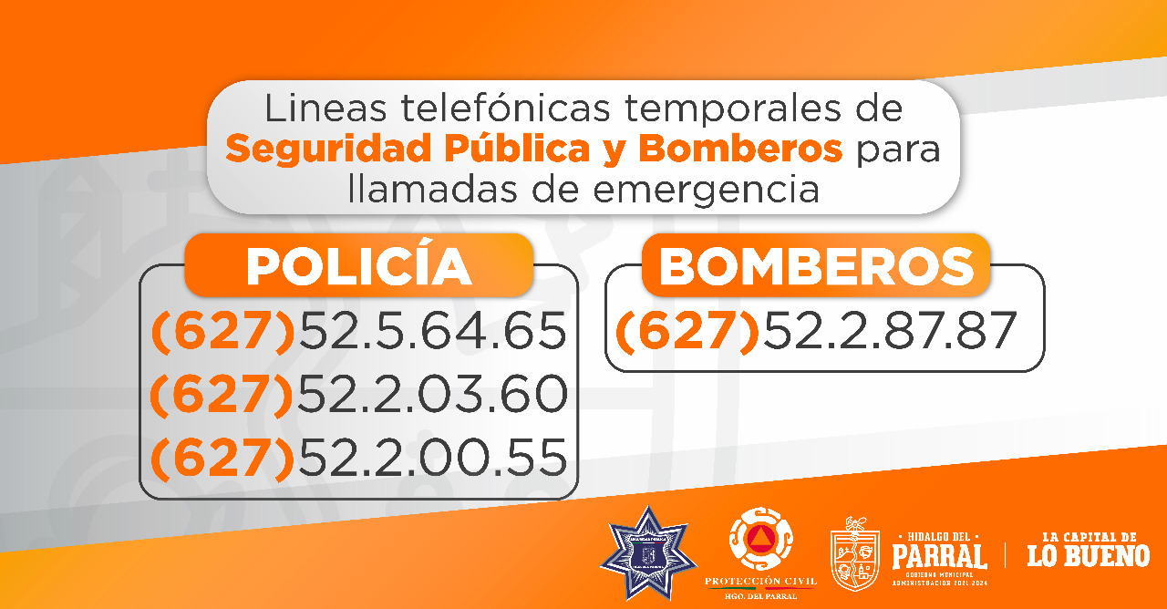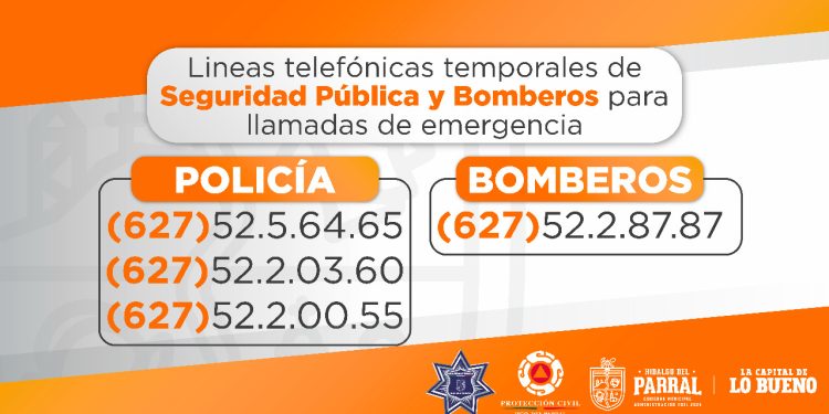 La Dirección General de Seguridad Pública Municipal informa a la comunidad parralense sobre fallas que se están presentando en estos momentos en el Sistema 9-1-1, por lo que se habilitó de manera temporal líneas para emergencias, siendo para la Policía los siguientes números: 627 52 564 65, 627 52 203 60 y 627 52 200 55; y para el caso de Bomberos, el 627 52 287 87.
