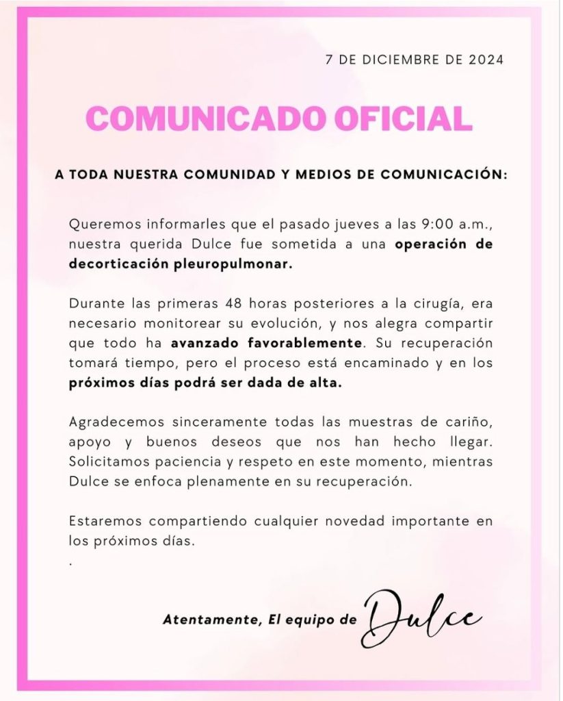 Meses después, en diciembre de 2024, Dulce pauso su gira debido a que fue hospitalizada por una neumonía, que requirió una operación de decorticación pleuropulmonar. Así, Dulce se convirtió en una de las artistas más queridas y aclamadas por el público.