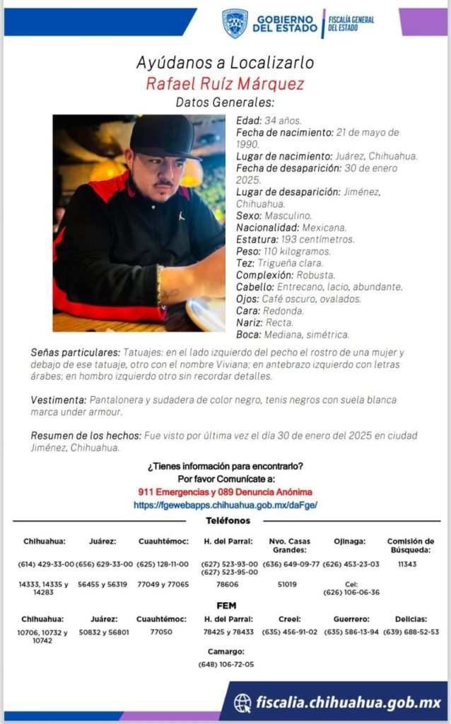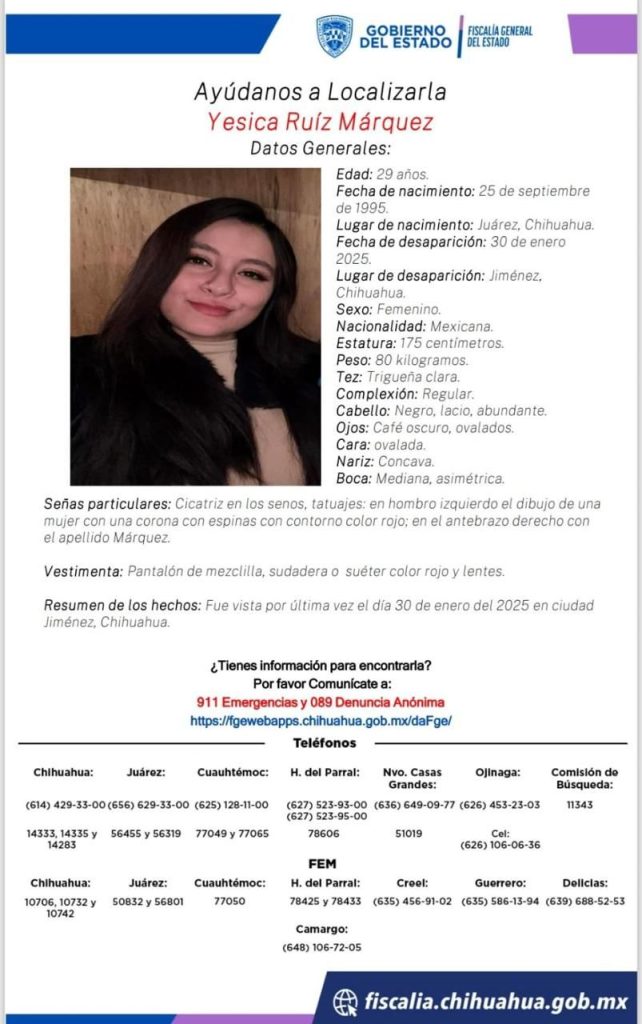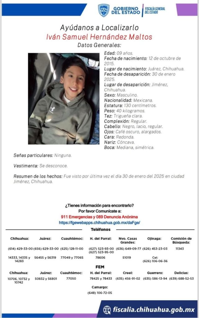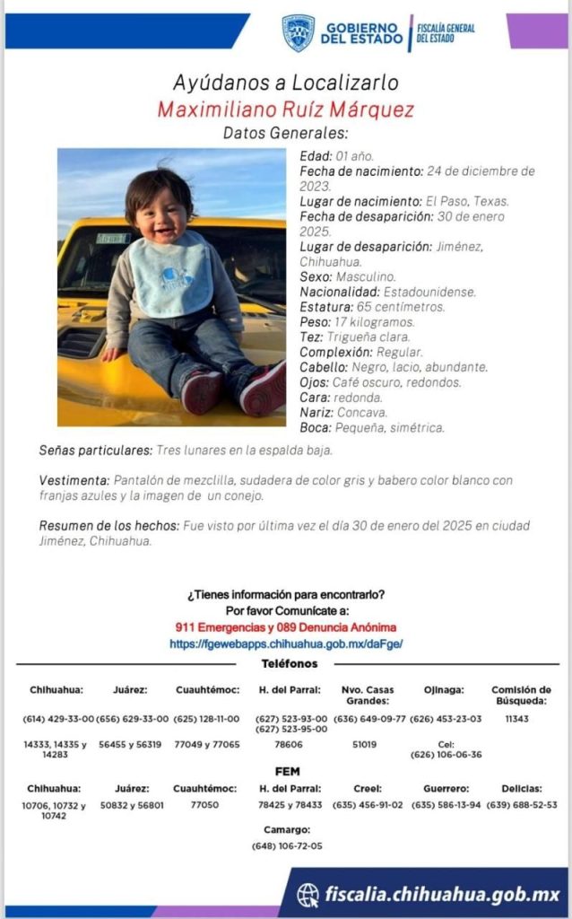 Una familia completa, originaria de Ciudad Juárez, desapareció en Jiménez, por lo que la Fiscalía General del Estado emitió pesquisas de los cinco integrantes, incluyendo un bebé de apenas un año de edad y un niño de 9 años.