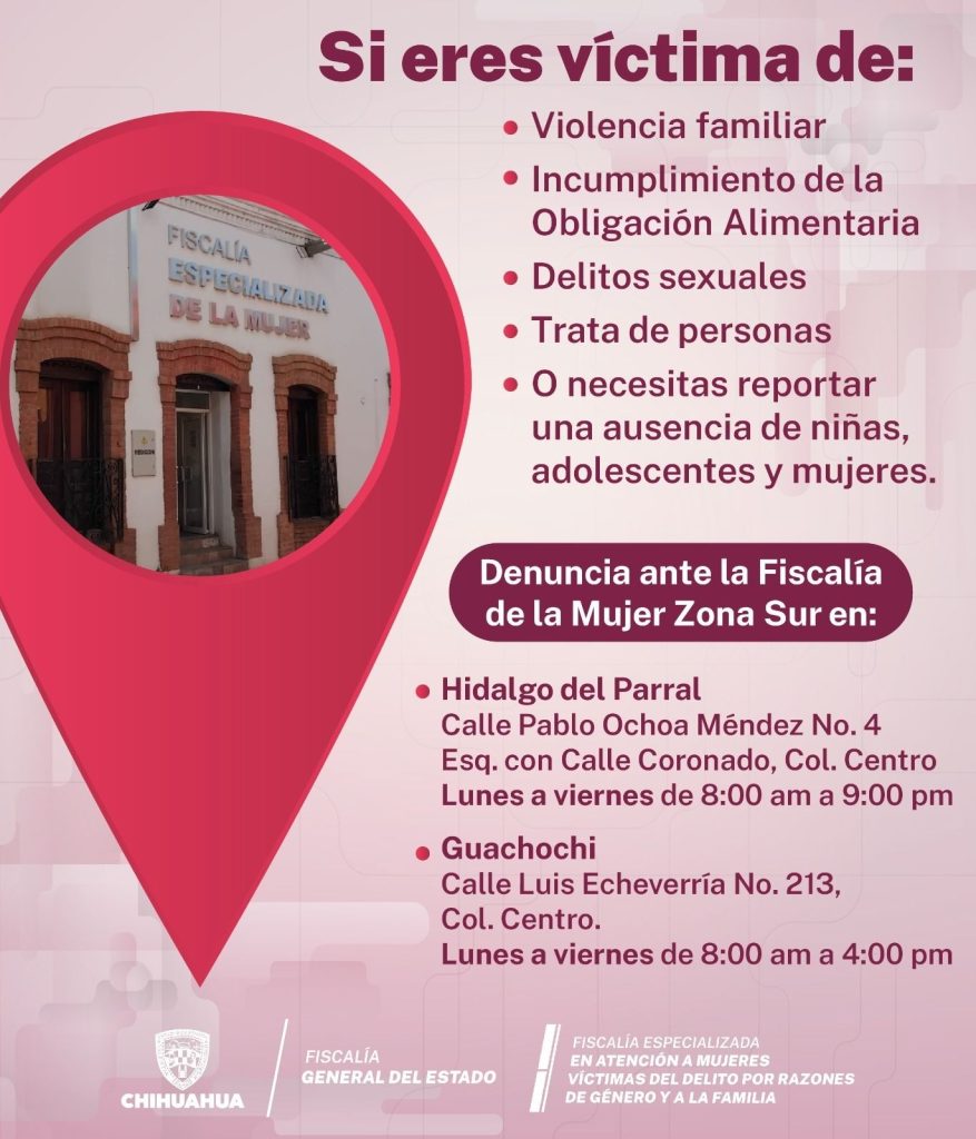 La Fiscalía Especializada en Atención a Mujeres Víctimas del Delito por Razones de Género y a la Familia, impulsa la denuncia de los delitos de género en la zona sur de la entidad, en donde esta representación social ofrece cobertura en los municipios de Hidalgo del Parral y Guachochi.