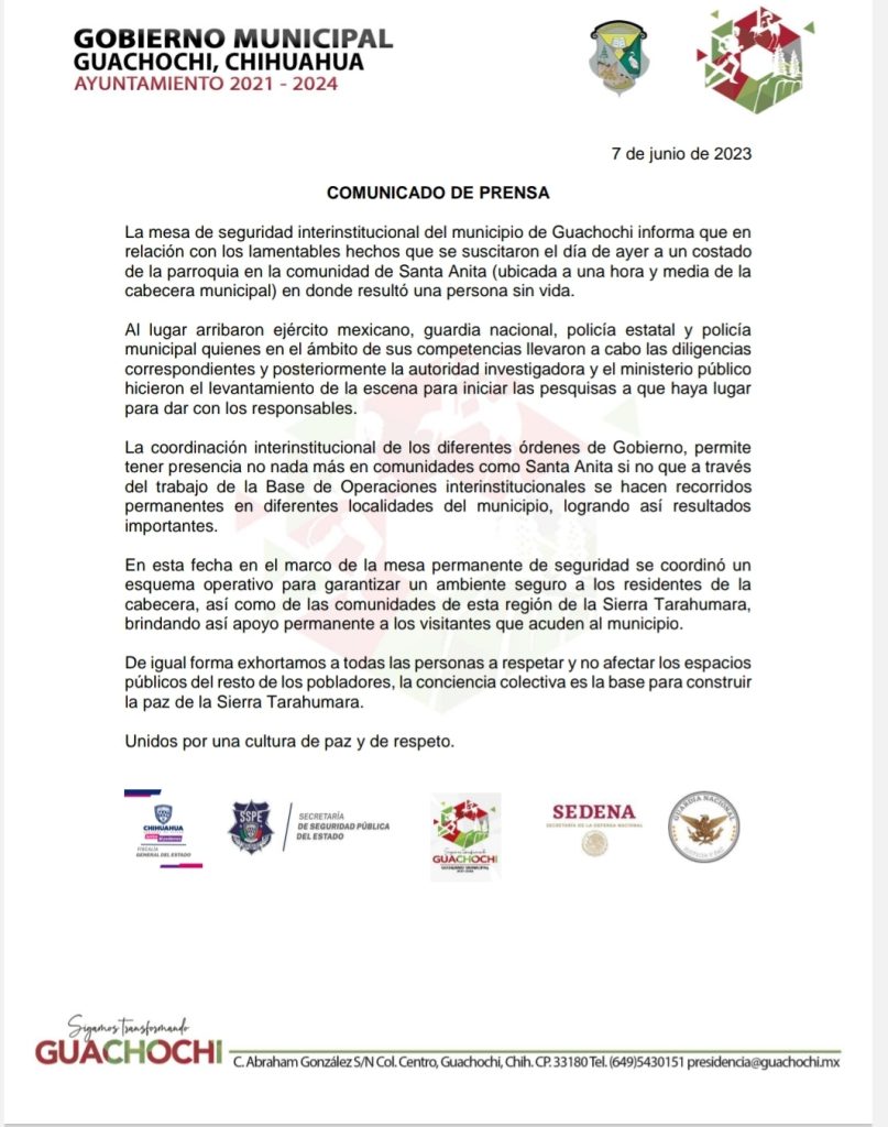 La Mesa de Seguridad Interinstitucional del municipio de Guachochi, informó que, en relación con los lamentables hechos que se suscitaron a un costado de la parroquia en la comunidad de Santa Anita, ubicada a una hora y media de la cabecera municipal, en donde resultó una persona sin vida, los diferentes órdenes de Gobierno, a través del trabajo de la Base de Operaciones, hacen recorridos permanentes en diferentes localidades del municipio, «logrando así resultados importantes», según se puede leer en un comunicado.