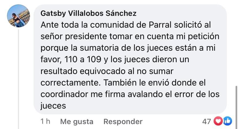 Por su parte, la ganadora legítima, Gatsby Villalobos Sánchez, solicitó al alcalde Peña que tomara en cuenta la sumatoria del puntaje, según la votación del jurado, misma que se inclinaba a su favor, no al de Daniela Moreno, como lo anunció el munícipe.