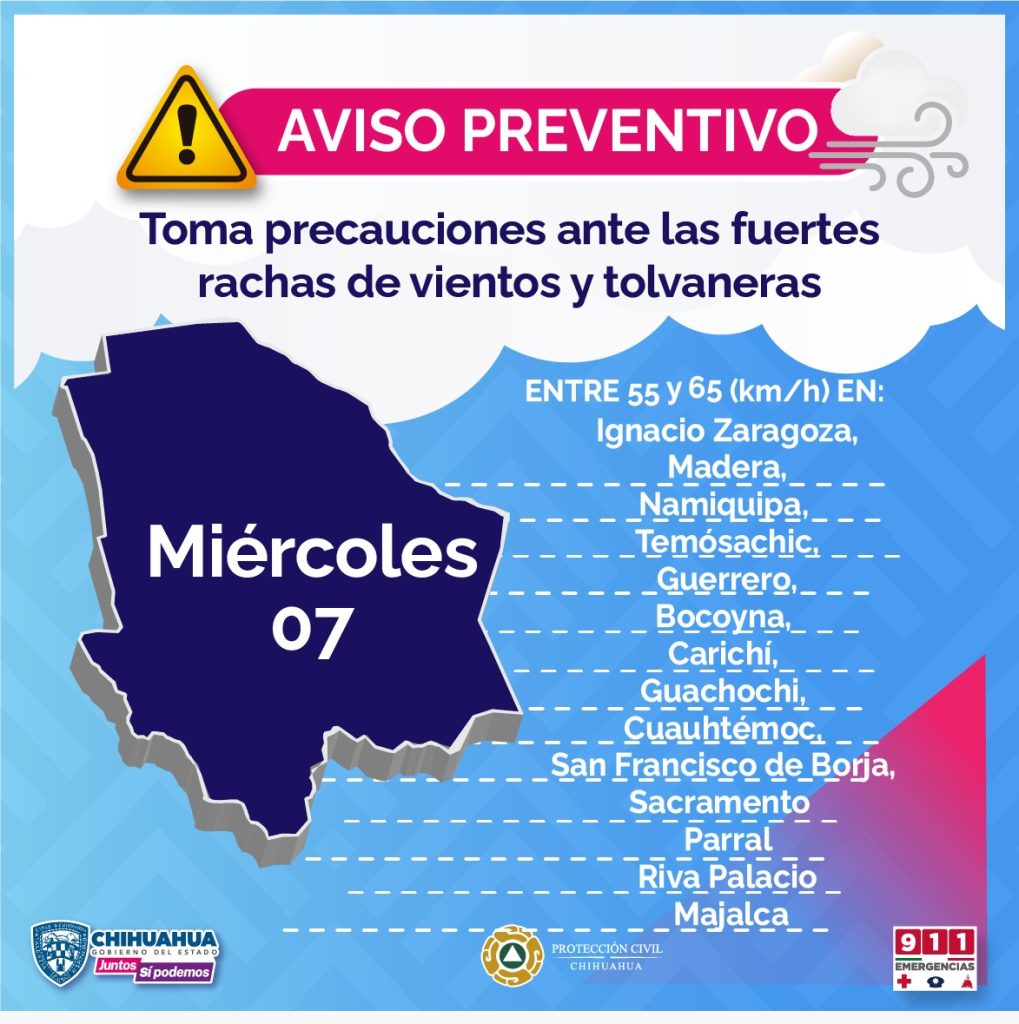 Además, se espera la presencia de viento con rachas que pueden superar los 65 kilómetros por hora (km/h) en partes de Riva Palacio y Majalca o por arriba de los 55 km/h en Ignacio Zaragoza, Madera, Namiquipa, Temósachic, Guerrero, Bocoyna, Carichí, Guachochi, Cuauhtémoc, San Francisco de Borja, Sacramento y Parral.